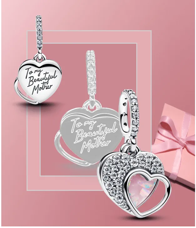 Crafted in sterling silver, this charm features two heart-shaped dangles. One has a sparkling mosaic effect and a cut-out heart. The other features a lab-created opal and the engraving 'To my Beautiful Mother'.