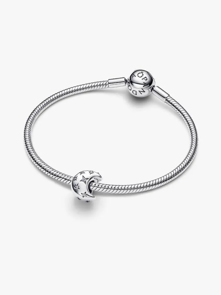 Aim high with the Crescent Moon Charm. Crafted in sterling silver and featuring flush-set starburst stones, it’s engraved with 'THE SKY IS THE LIMIT' — a reminder to dream big and reach beyond.