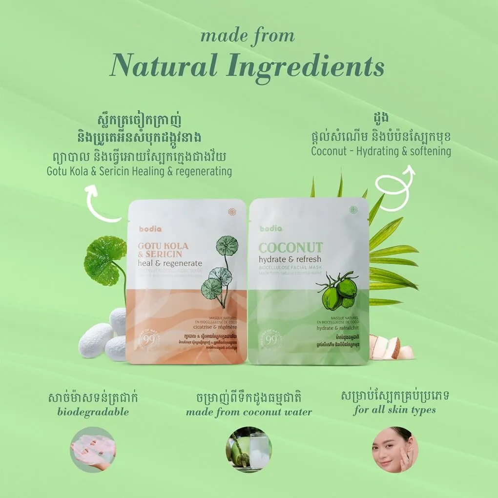 Made from fresh coconut water through an Eco-Friendly process, this natural mask features a soft, jelly-like texture just like real coconut pulp.Now enriched with Gotu Kola, this herb remedy heal, soothes, and leaves your skin feeling calm, soft. with Sericin that help soften and enhance the collagen production