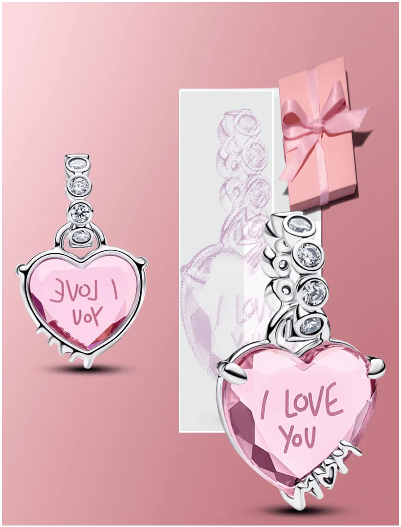 Say it all this Mother's Day with our engraved heart dangle charm. A heart-shaped pink stone is set in sterling silver with the word 'MOM' scripted into the setting. The heart itself features the message 'I LOVE YOU'.