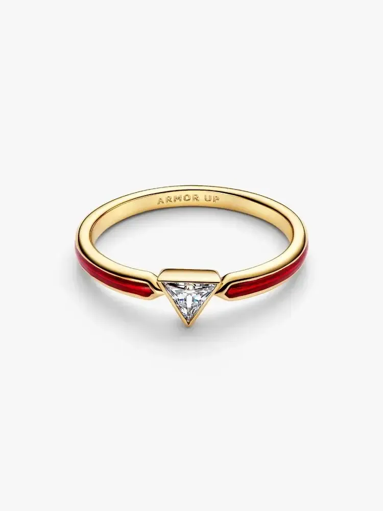 Carry the action wherever adventure takes you with our Iron Man-inspired ring. Crafted to shine in 14k gold plating, it features a triangle-shaped stone and the engraving 'ARMOR UP'.