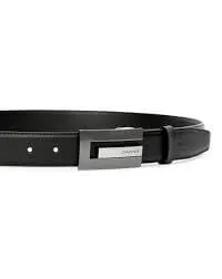 This men's genuine leather belt features a flat, square block buckle with perforated holes. The buckle is made of matte black and silver alloy with a grooved logo positioned in the right corner. The belt strap is made of smooth black genuine leather with reinforced stitching along the edges. The logo is embossed on the end of the strap. This modern and simple design makes it suitable for both casual and business attire.