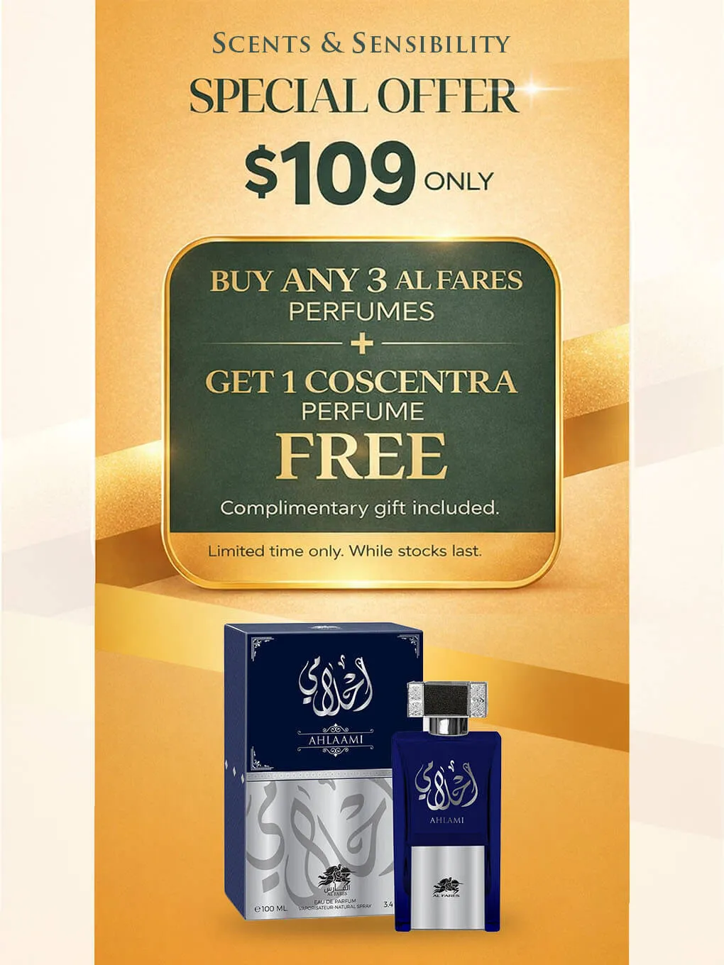 $109 FOR BUY ANY 3 AL FARES Perfumes + 1 COSCENTRA FREE (Promo Set) - AL FARES AHLAAMI 80ML