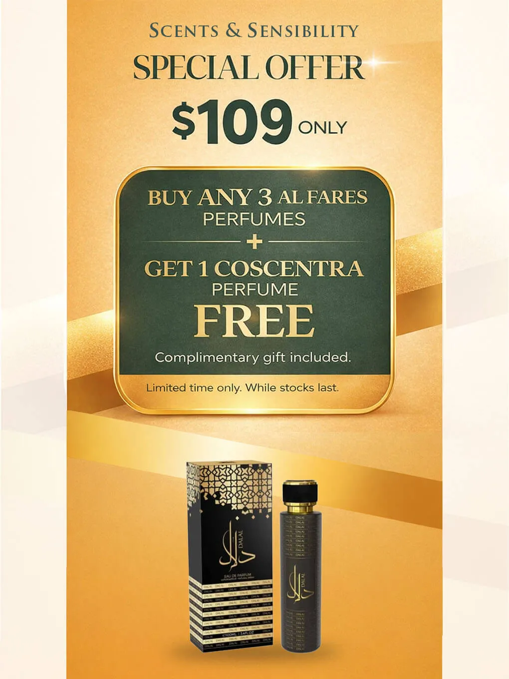-Buy ANY 3 AL FARES perfumes for $109 and receive 1 COSCENTRA perfume FREE as a gift.