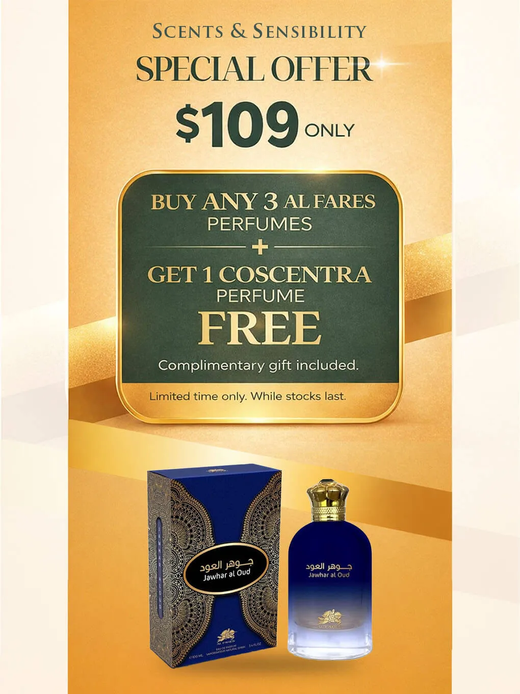 -Buy ANY 3 AL FARES perfumes for $109 and receive 1 COSCENTRA perfume FREE as a gift.