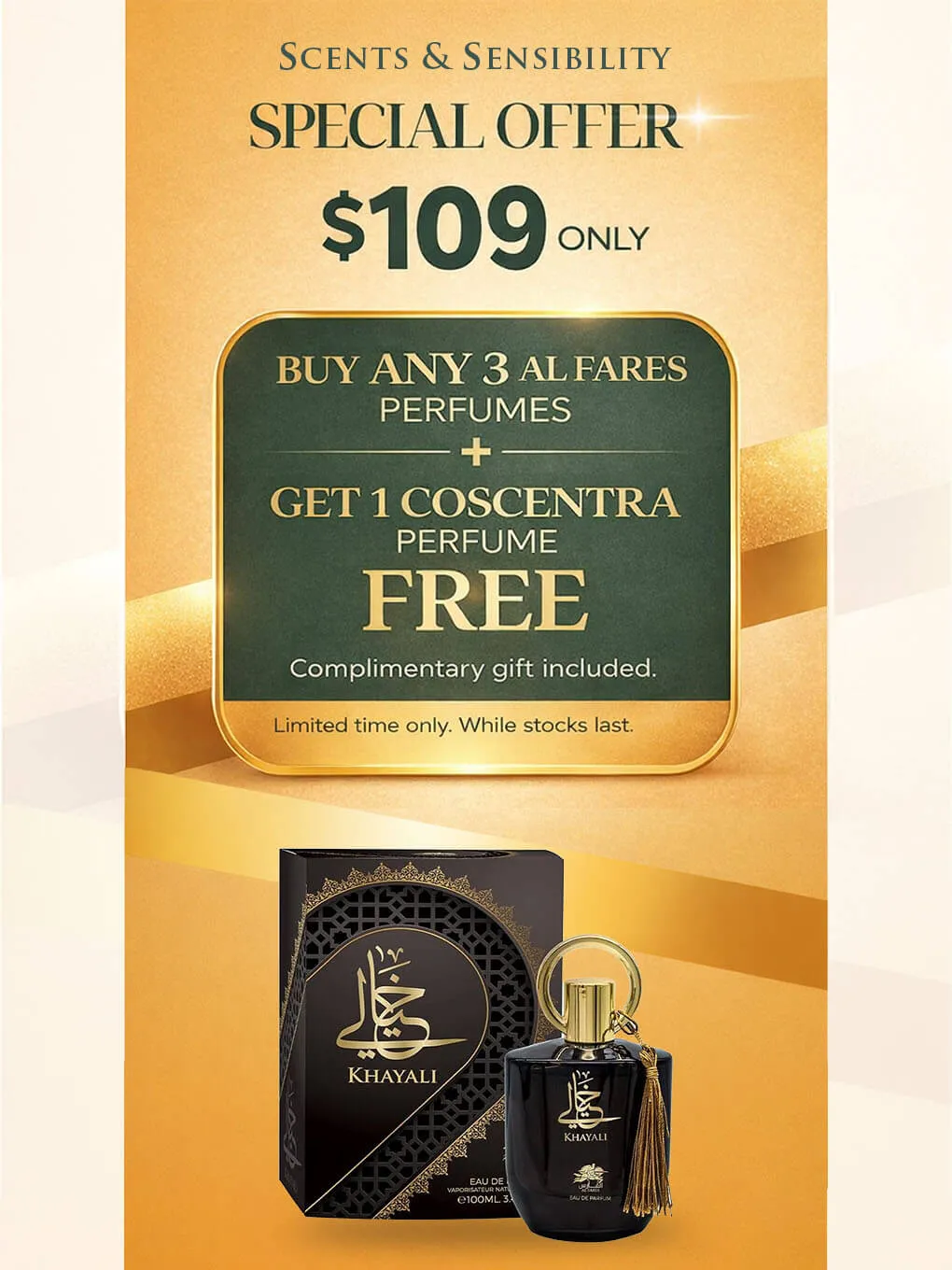 -Buy ANY 3 AL FARES perfumes for $109 and receive 1 COSCENTRA perfume FREE as a gift.