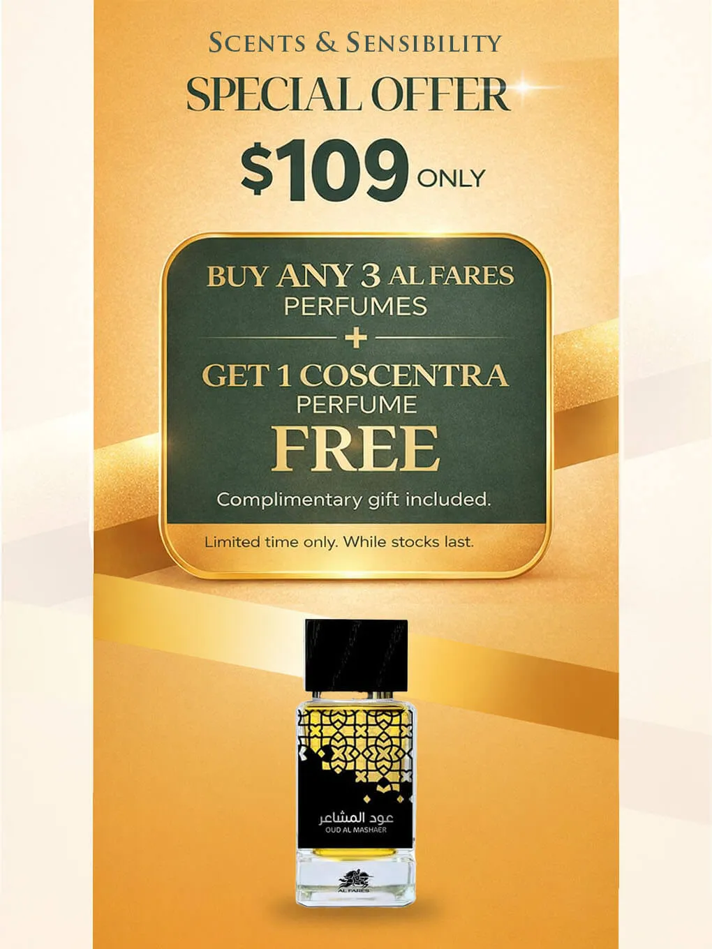 $109 FOR BUY ANY 3 AL FARES Perfumes + 1 COSCENTRA FREE (Promo Set) - AL FARES OUD AI MASHAER 100ML