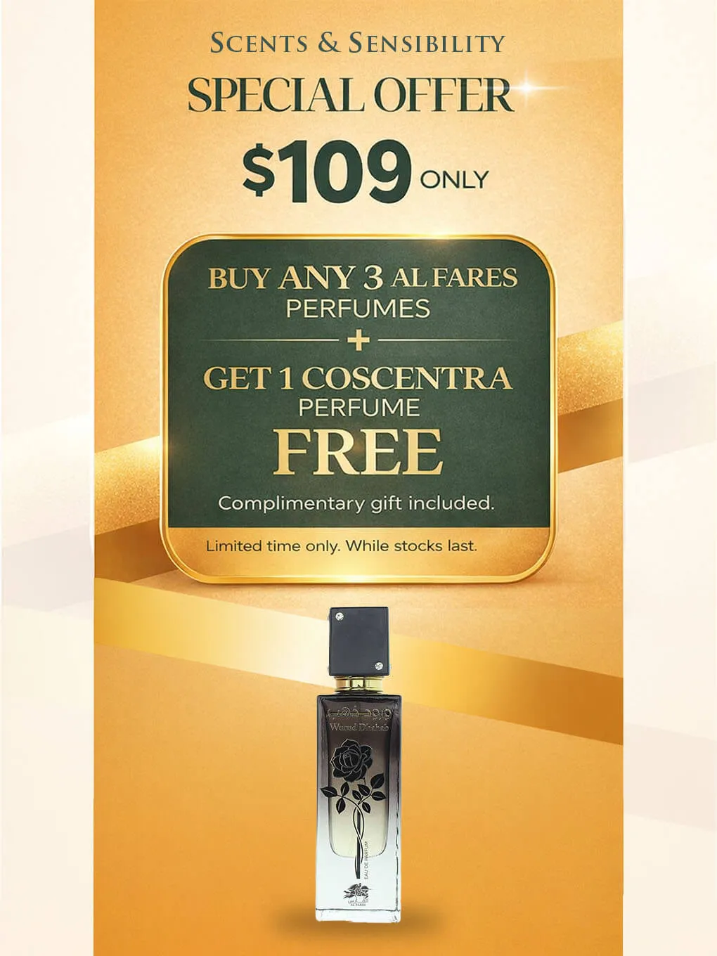 $109 FOR BUY ANY 3 AL FARES Perfumes + 1 COSCENTRA FREE (Promo Set) - AL FARES WURUD DHAHAB 80ML