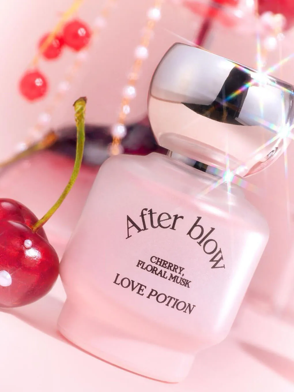 After Blow Eau de Parfum “Love Potion” is a seductive, fruity-floral scent that opens with juicy pear and tangerine, blossoms into cherry, rose and orange blossom at its heart, and settles into a warm base of vanilla, amber and musk.