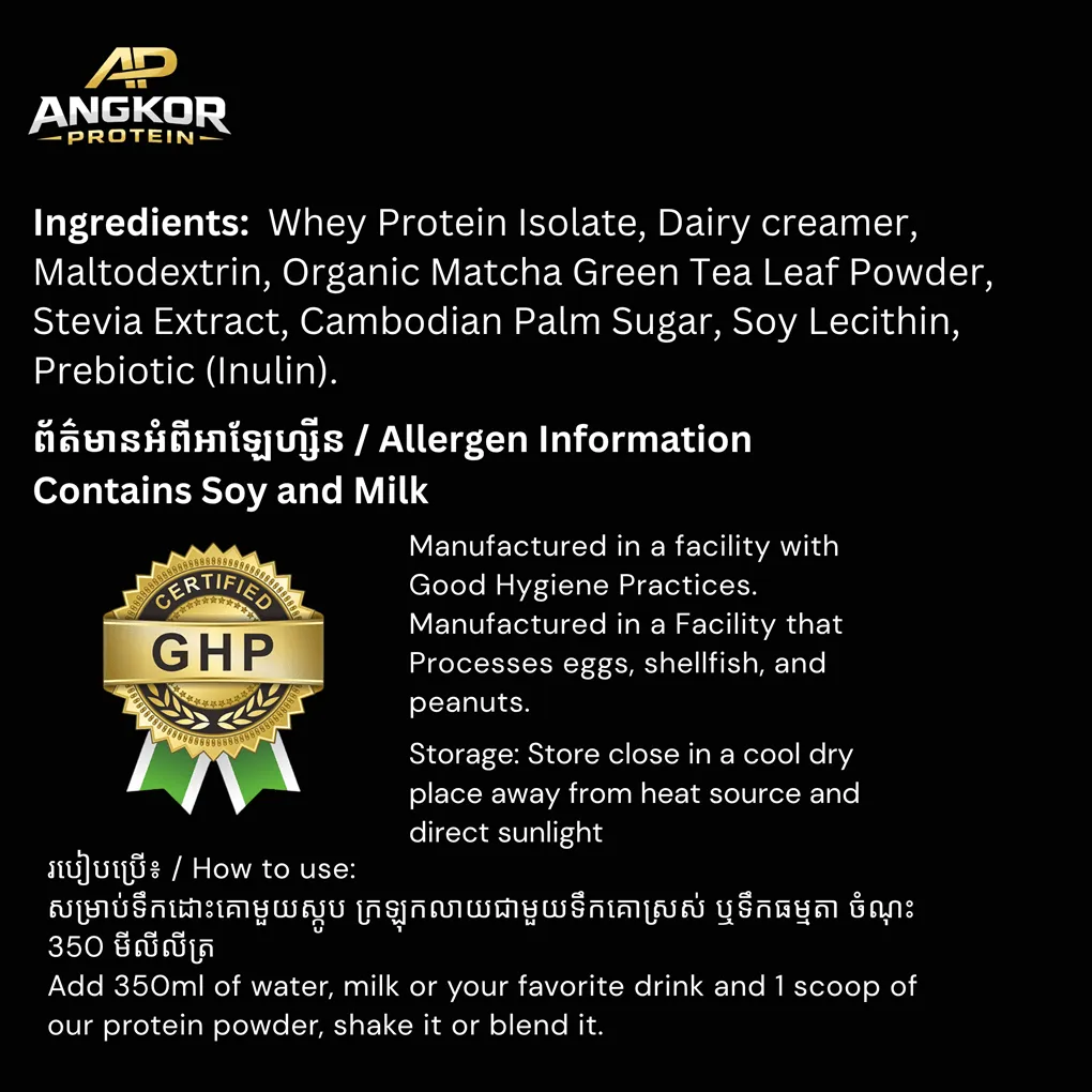 Angkor Protein Whey Protein is a delicious blend of high quality whey protein concentrate and isolate from New Zealand’s recognized high quality manufacturer. This blend of specially processed whey proteins is designed to maximize amino acid absorption and biological value (BV). Each 1 scoop serving typically has about 5,300 mg of branched-chain amino acids (BCAAs). Extra inulin has also been added to this blend. In addition, matcha green tea, a superfood with naturally occurring polyphenols and chlorophyll. It’s the perfect alternative to coffee and because of its strong flavor, it is an invigorating add-on to a protein shake.
