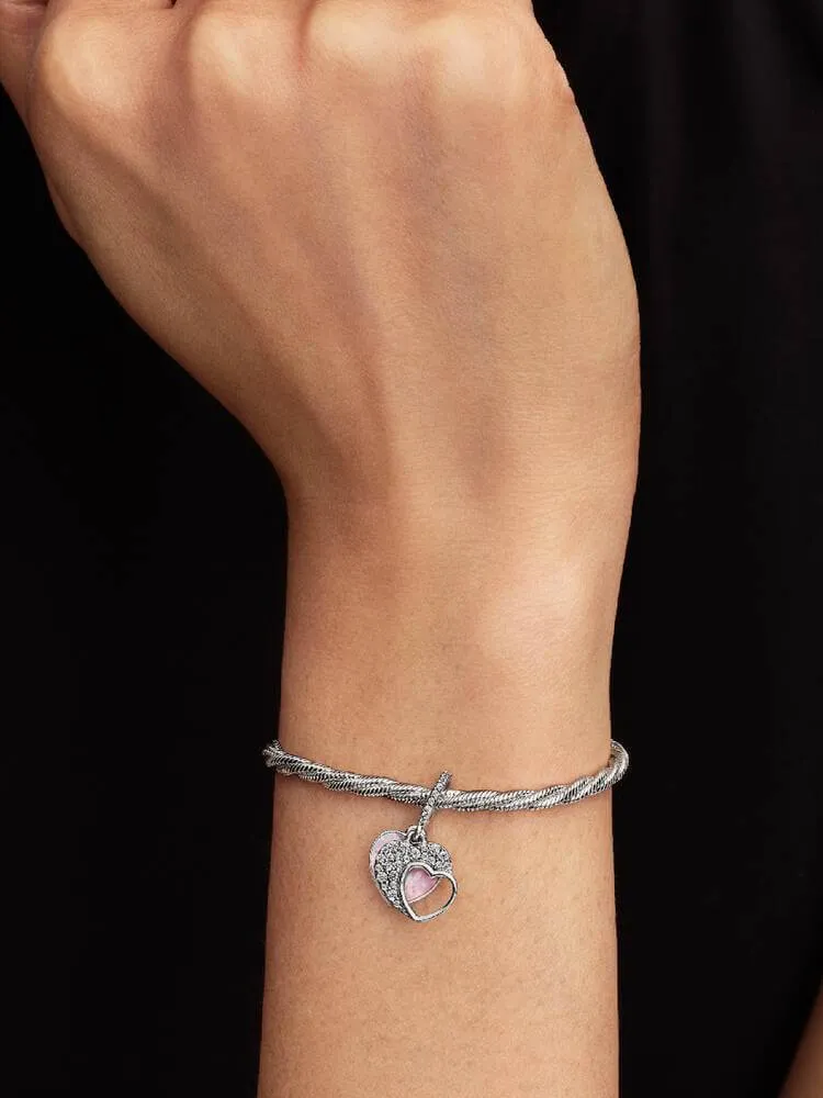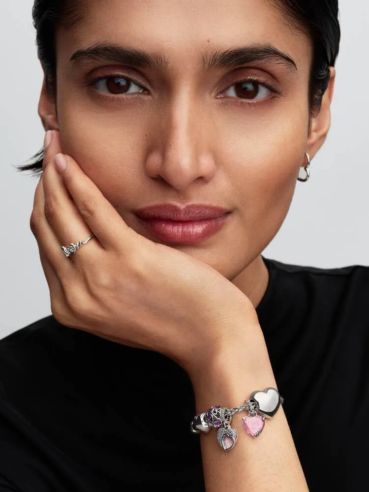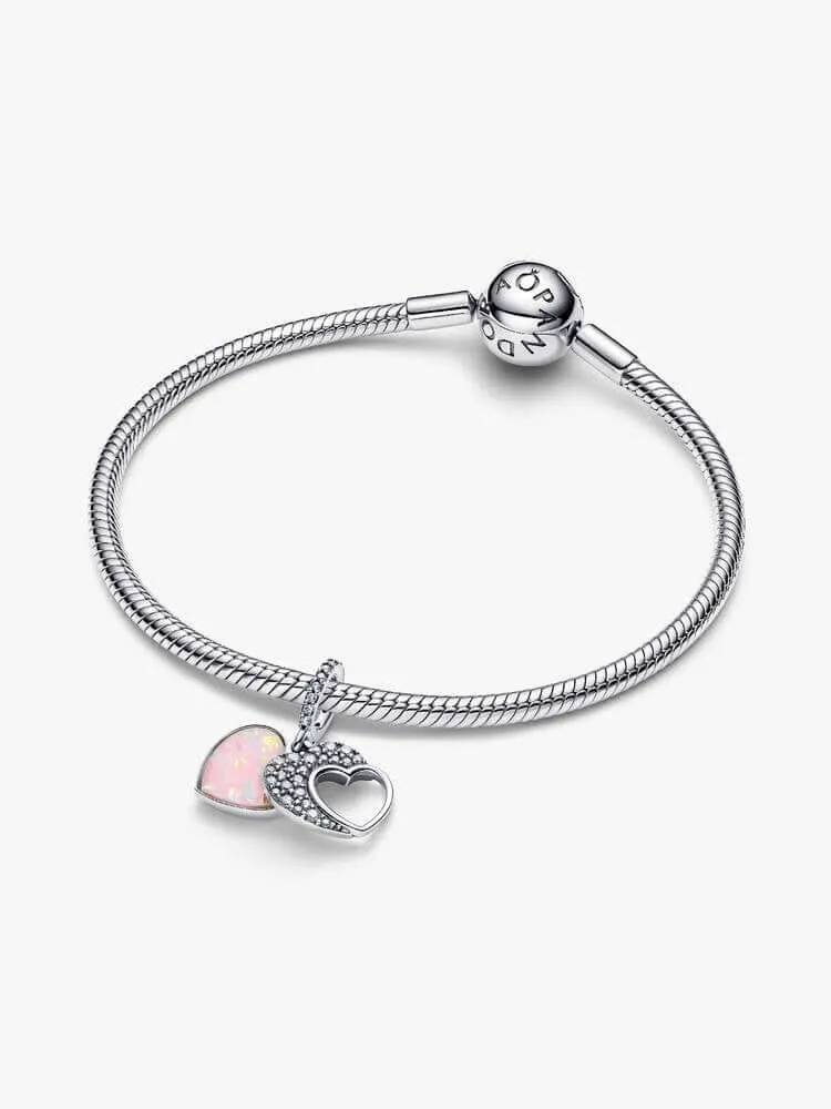 Crafted in sterling silver, this charm features two heart-shaped dangles. One has a sparkling mosaic effect and a cut-out heart. The other features a lab-created opal and the engraving 'To my Beautiful Mother'.
