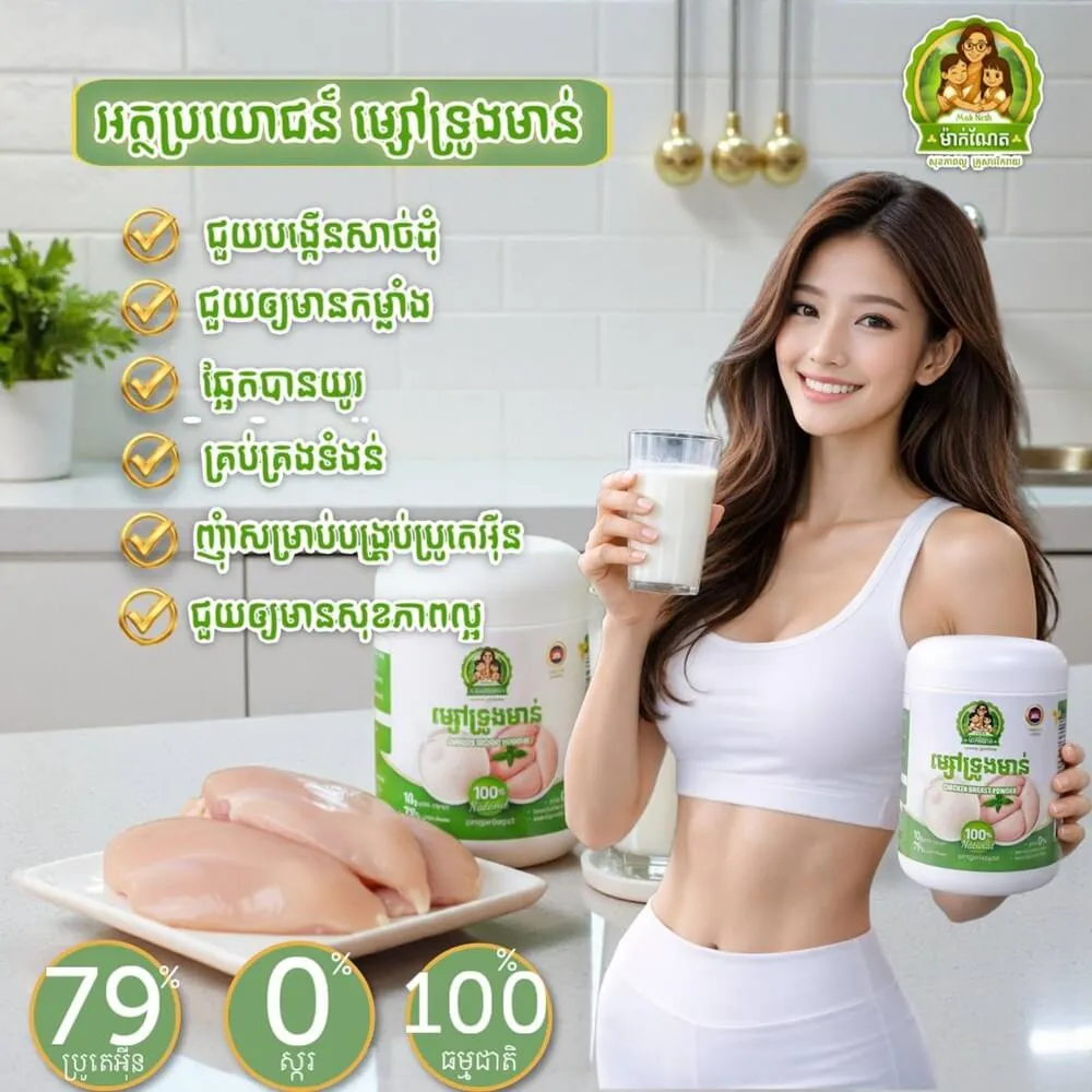 Fuel your workout and weight loss goals with clean, natural protein made from real chicken breast. Our Cambodian chicken breast powder delivers 79% protein, perfect for muscle recovery, fat loss, and healthy meals with no sugar or preservatives.