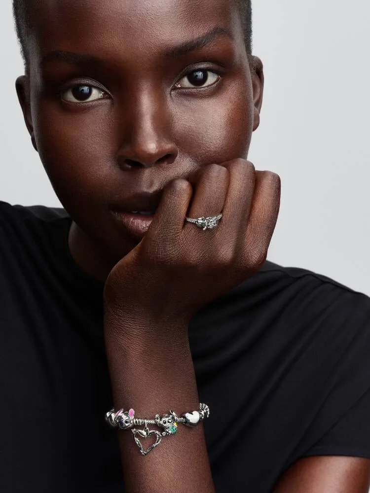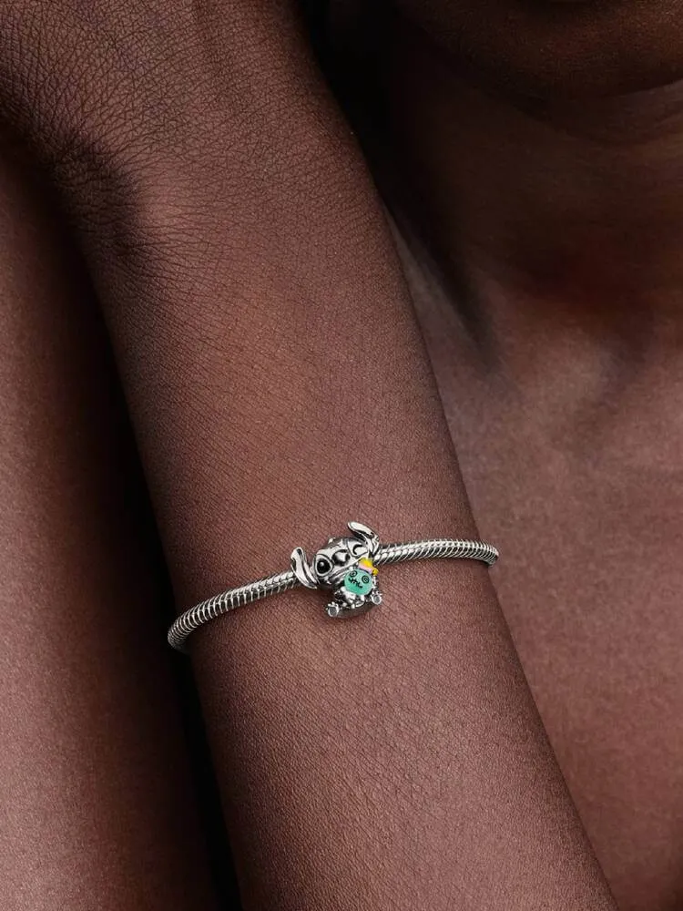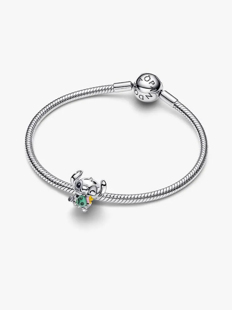 Feel the love and friendship with Disney's Stitch. Crafted in sterling silver, Stitch is seen cuddling Scrump, his pal Lilo's favourite doll. Scrump comes to life in green Murano glass with pops of colourful enamel.