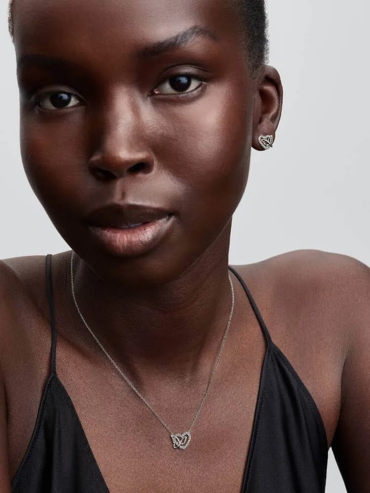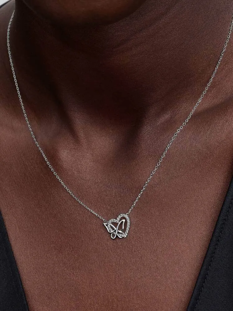Flutter into love. Our openwork necklace features a sterling silver heart entwined with a butterfly, and is set with sparkling stones. Wear it as a reminder that love and nature are deeply connected.