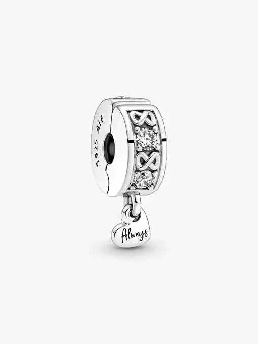 Functional yet stylish, the Family Always Pavé Clip Charm features an alternating infinity symbol and stone pattern on the rim. The polished sterling silver heart dangle is engraved with "Always" to remind us that the love of family is eternal. This clip charm has a silicone grip to prevent sliding and can be styled anywhere on a bracelet except raised charm dividers.