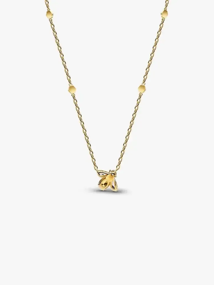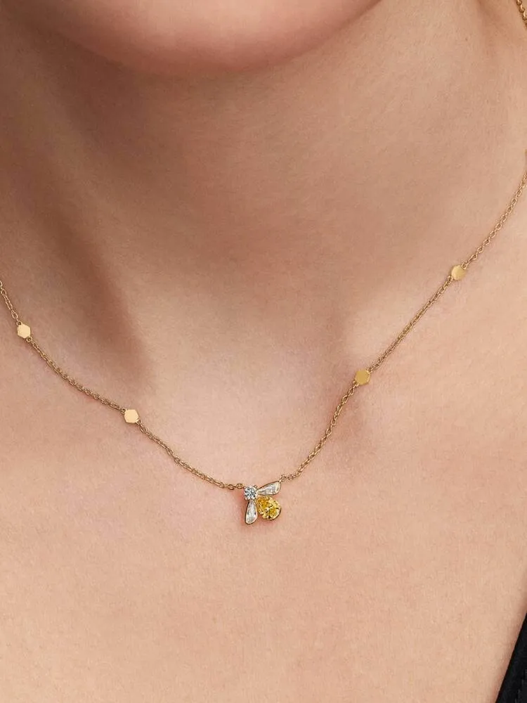 Get your style buzzing. Our 14k gold-plated necklace features a vibrant yellow and clear stone bee fixed on a chain with honeycomb details. Sweet sparkle fit for a queen bee.