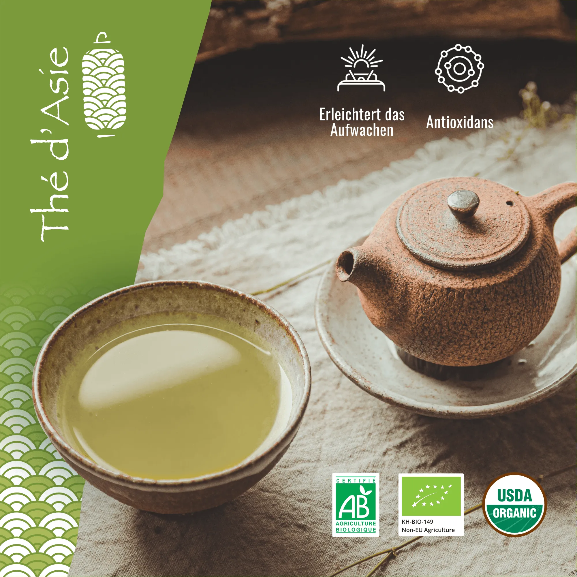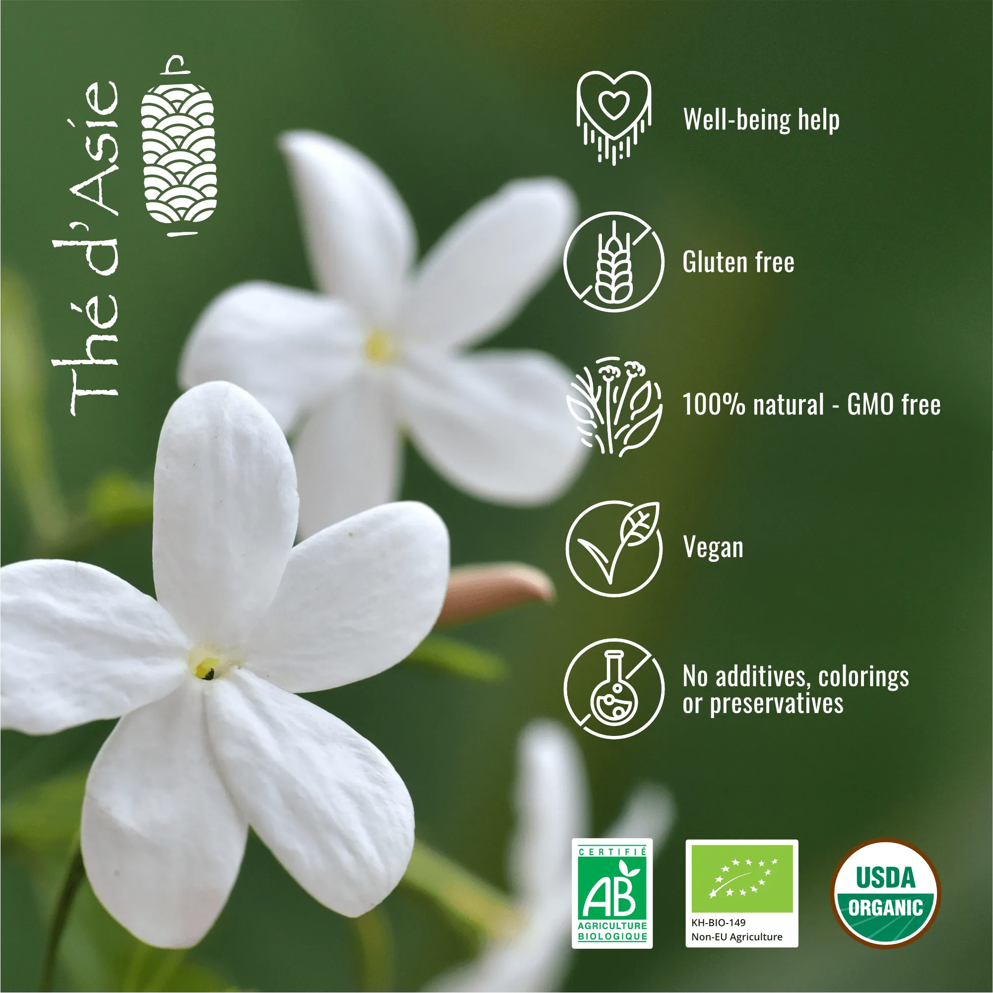 Jasmin green tea : Created by combining jasmine flowers with green tea, our tea offers a sweet and floral flavor. Its benefits are reduced stress, cardiovascular problems and improved digestion.