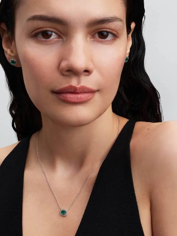 Enter your emerald-green era. Featuring a green centre stone surrounded by pavé on a sterling silver chain, this statement-making necklace is inspired by classic jewellery box treasures.