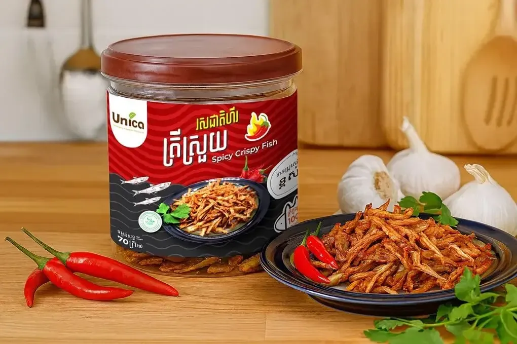 Unica's Spicy Crispy Fish, made from locally-sourced Sumatra River sprat, is seasoned with aromatic spices and crisped to perfection for an unforgettable crunch. This nutritious and flavorful snack offers a delightful, savory experience in every bite.