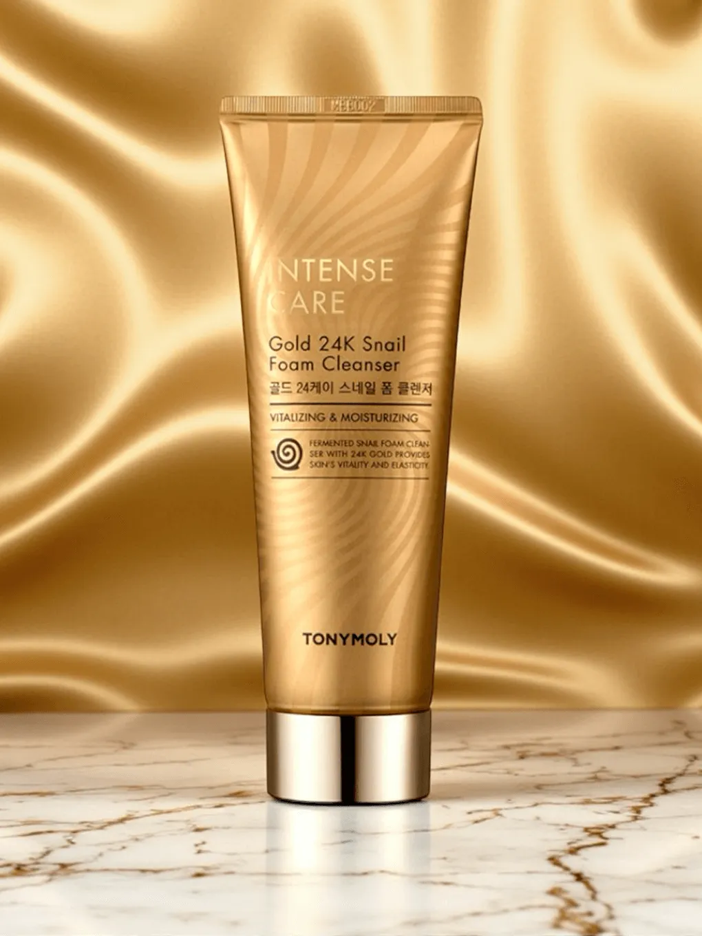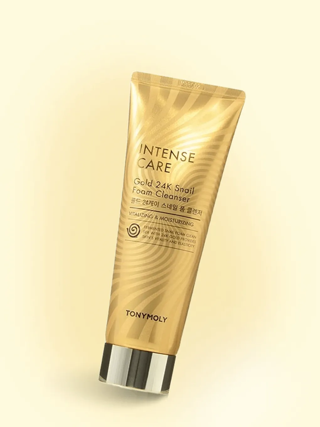 TONYMOLY Intense Care Gold 24K Snail Foam Cleanser 150 ml is a rich, creamy facial cleanser infused with snail mucin and 24K gold to gently remove dirt, makeup, and impurities while hydrating, soothing, and brightening the skin, leaving it clean, smooth, and radiant.