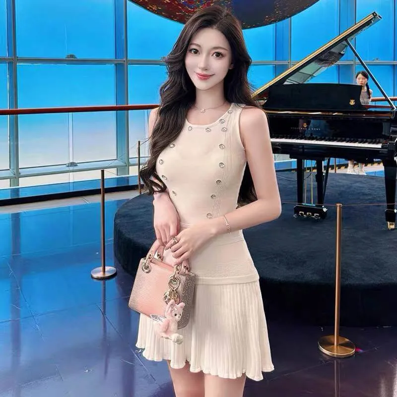 Slim-fit sleeveless vest top and pleated knit skirt two-piece set
