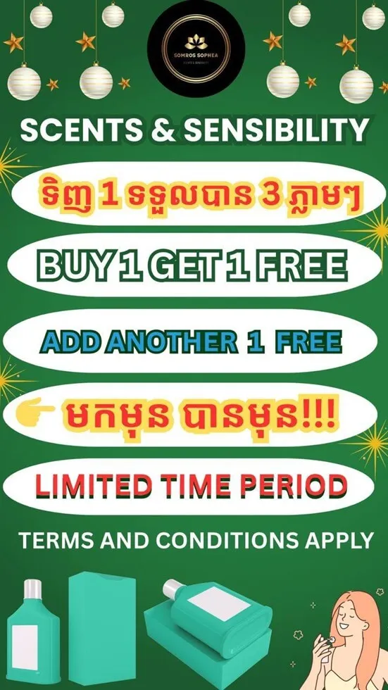 📢 LIMITED TIME PROMOTION! ❗ Buy 1 Get 1 FREE at Scents & Sensibility by Somros Sophea🎉 ✨Adding ON for every USD150 spent or more gets a EXTRA gift from us! 🎁 🏃🏻♀️ So head right down now to get your favorite fragrances!