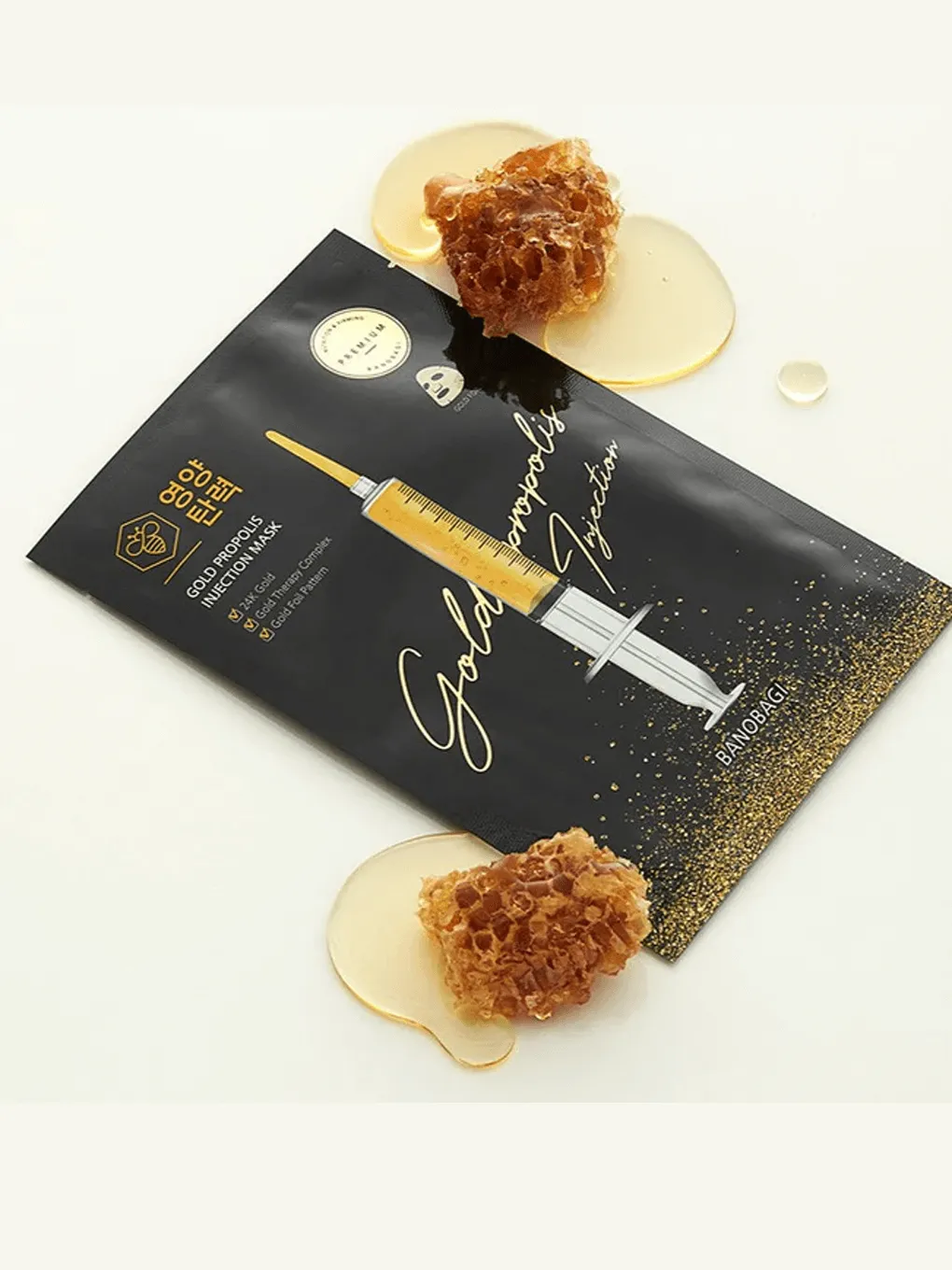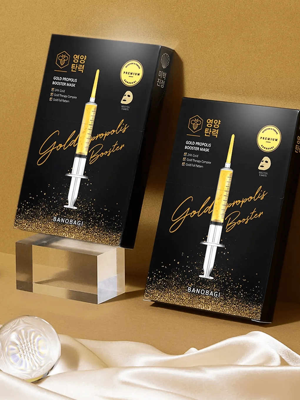 Banobagi Gold Propolis Booster Mask is a nourishing sheet mask infused with propolis extract and gold particles to soothe, hydrate, and strengthen the skin. It helps calm irritation and restore moisture, leaving the complexion smooth, radiant, and energized.