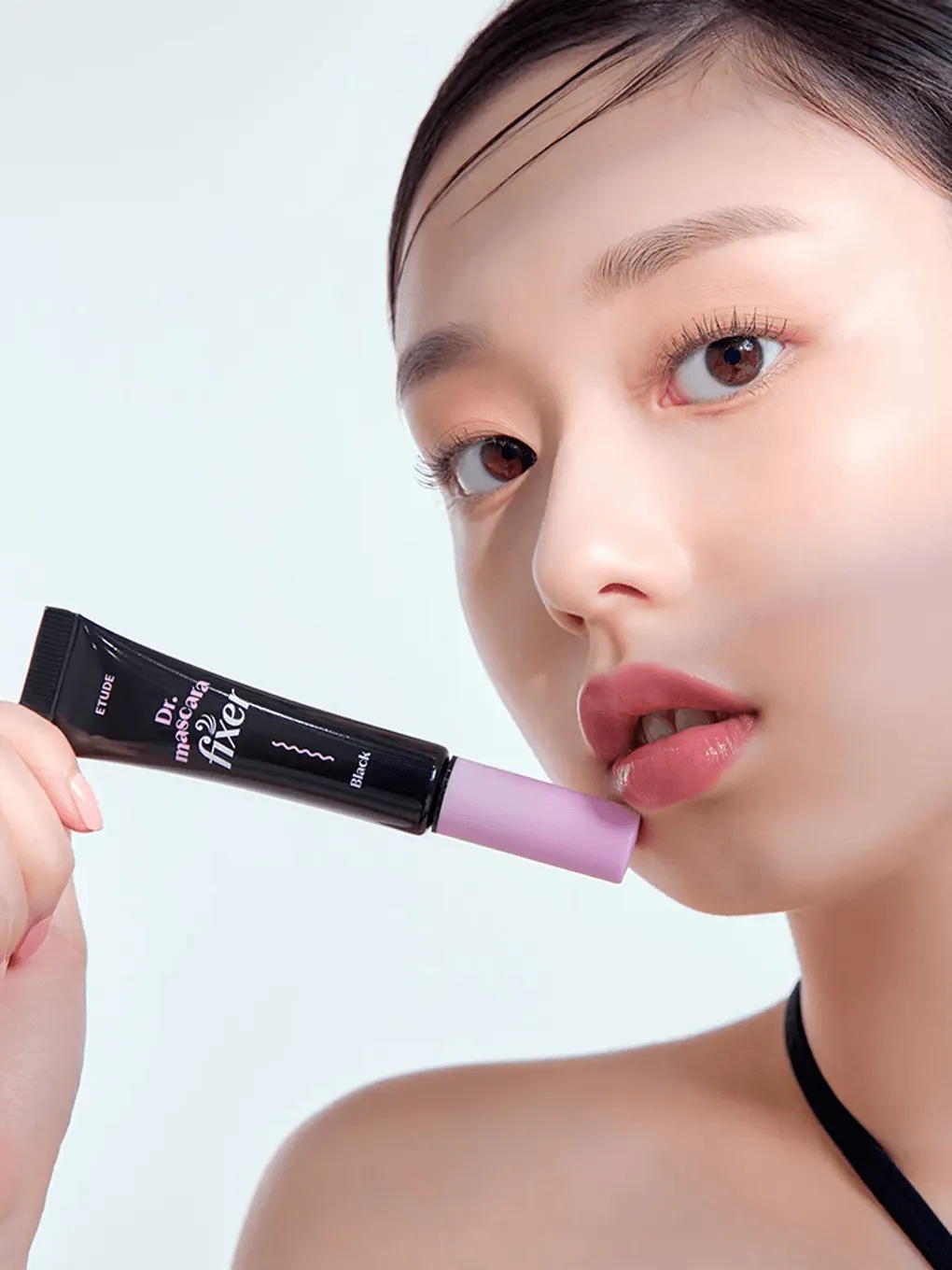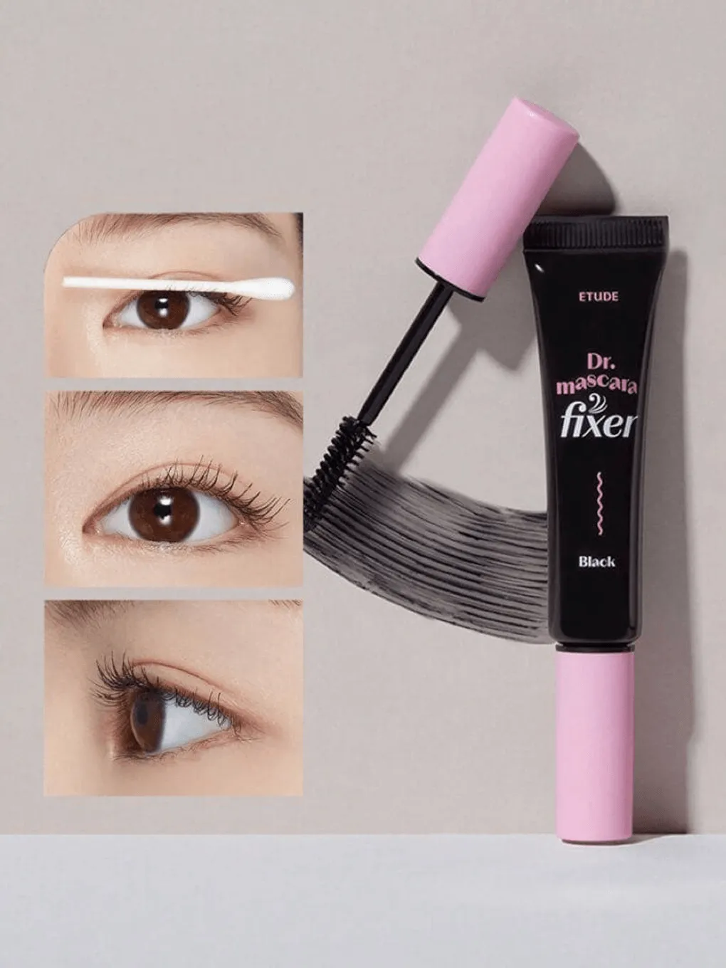 Etude House Dr. Mascara Fixer locks your mascara in place for all-day wear, preventing smudges and flaking while keeping lashes smooth, defined, and voluminous.