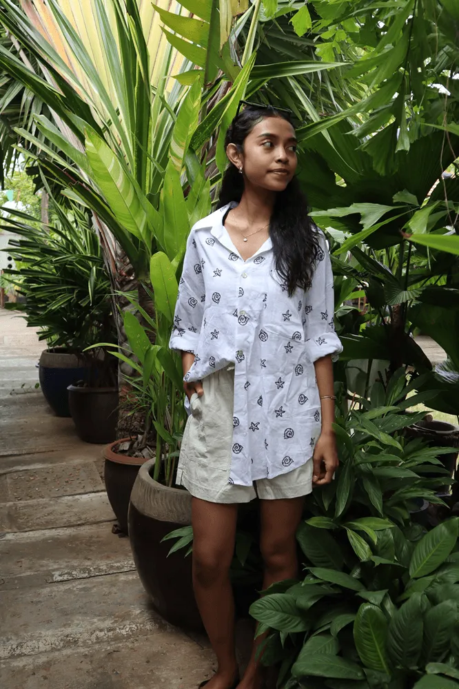 Oversized linen shirt with shell buttons, blue embroidery, and long, fold-up sleeves.
