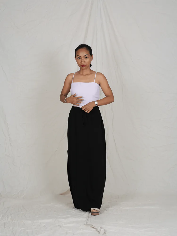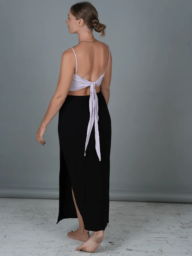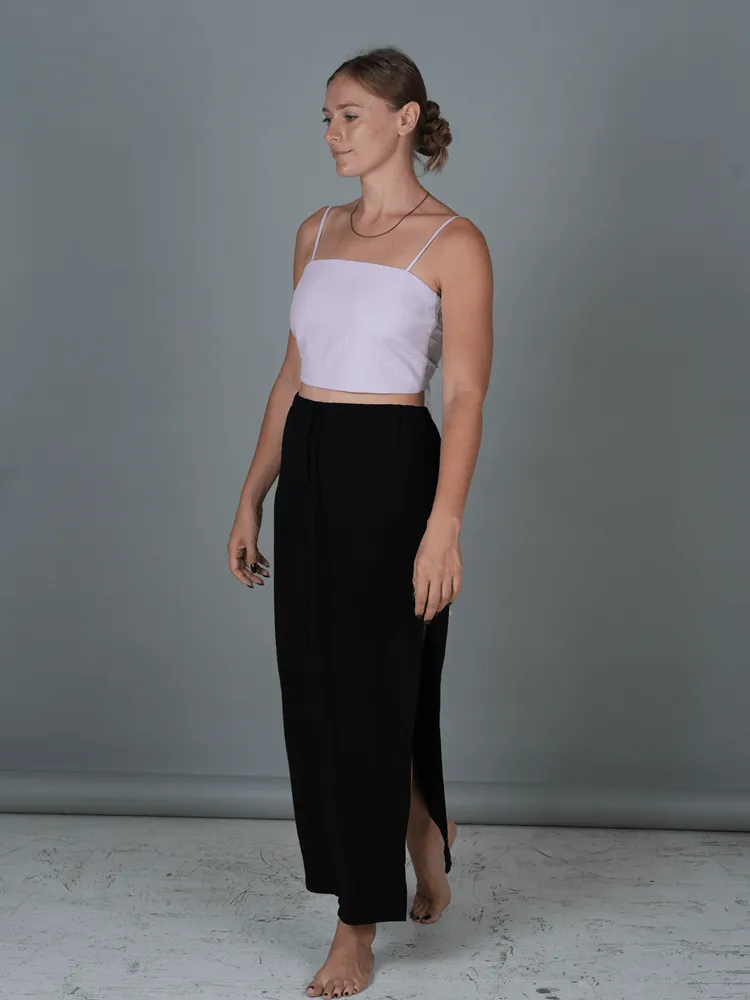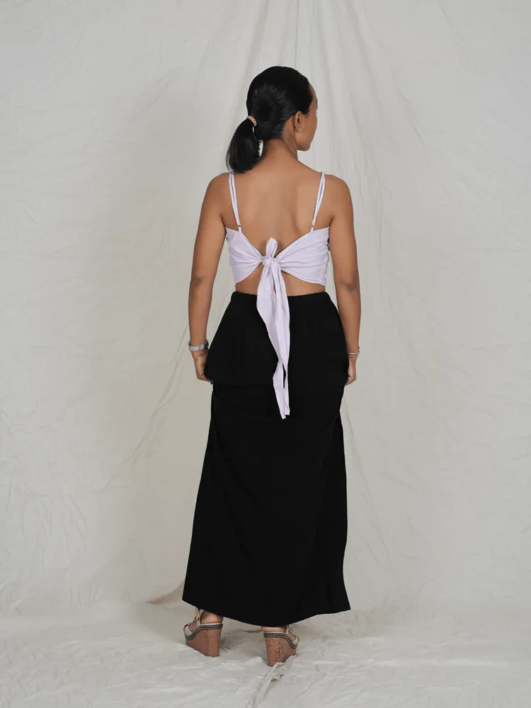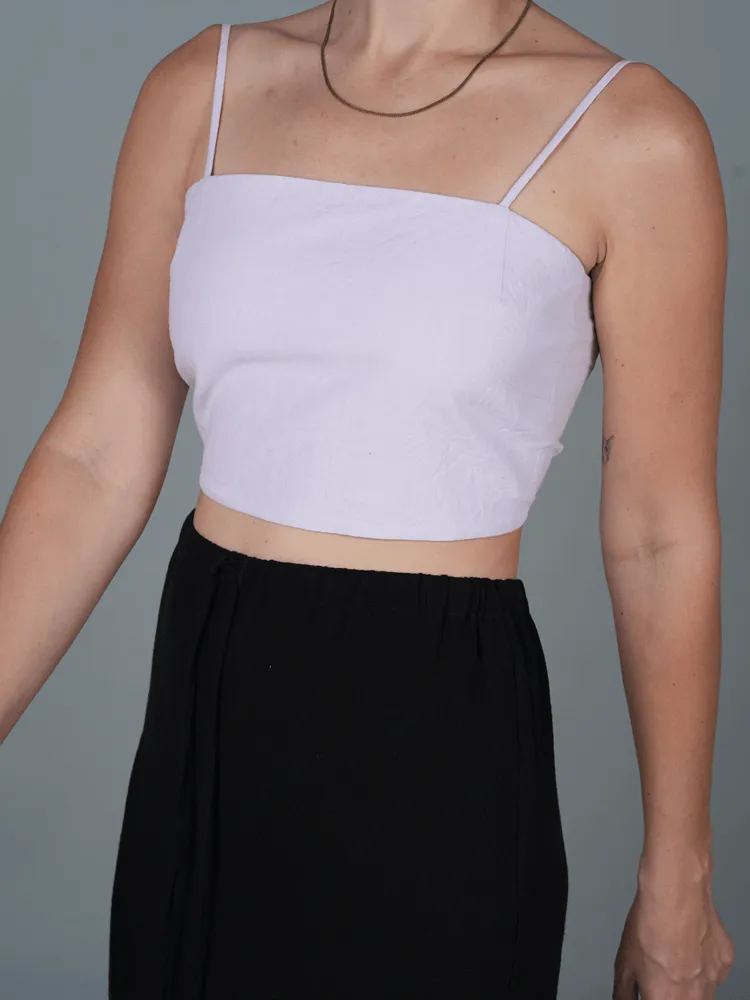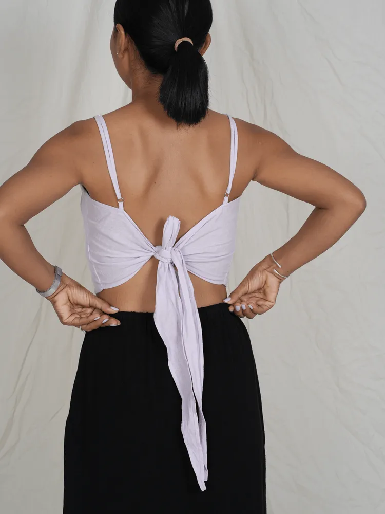Simple neckline linen crop with adjustable straps and a bow-tie back