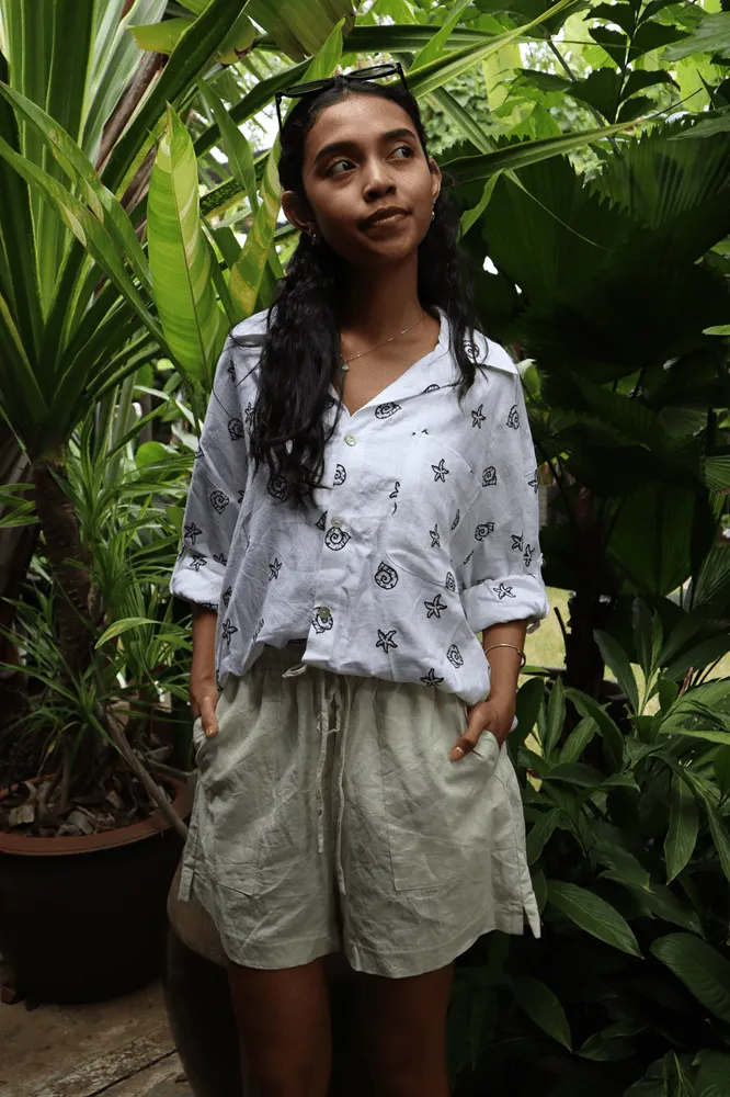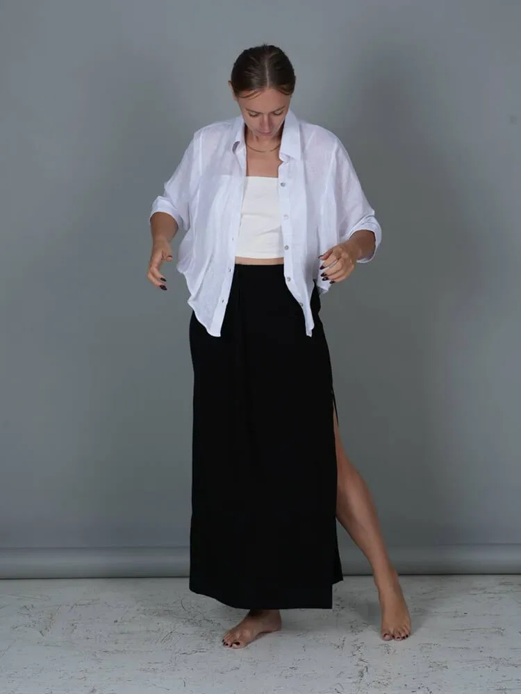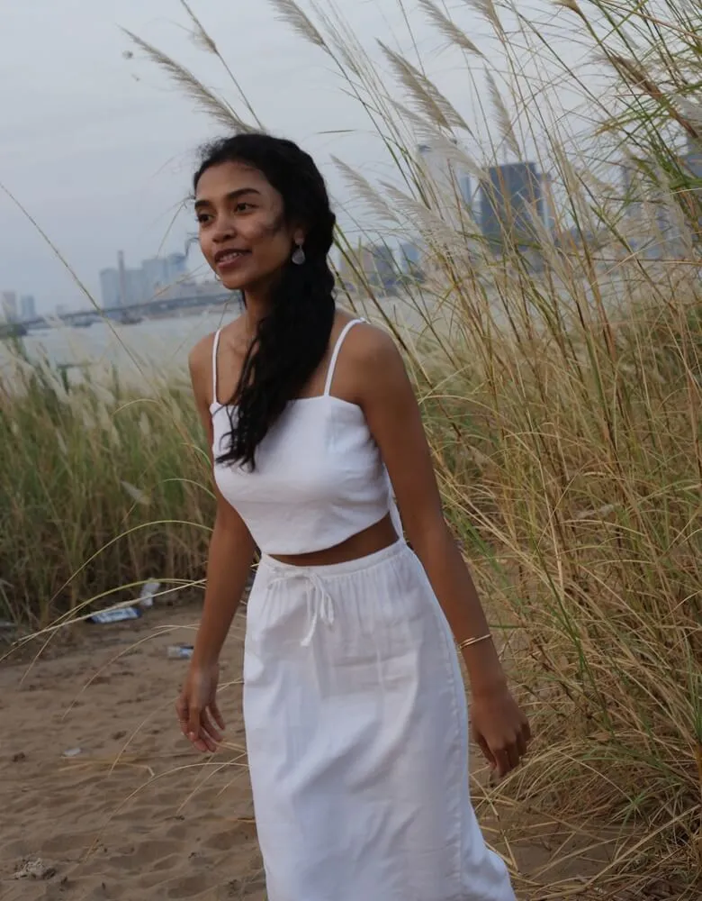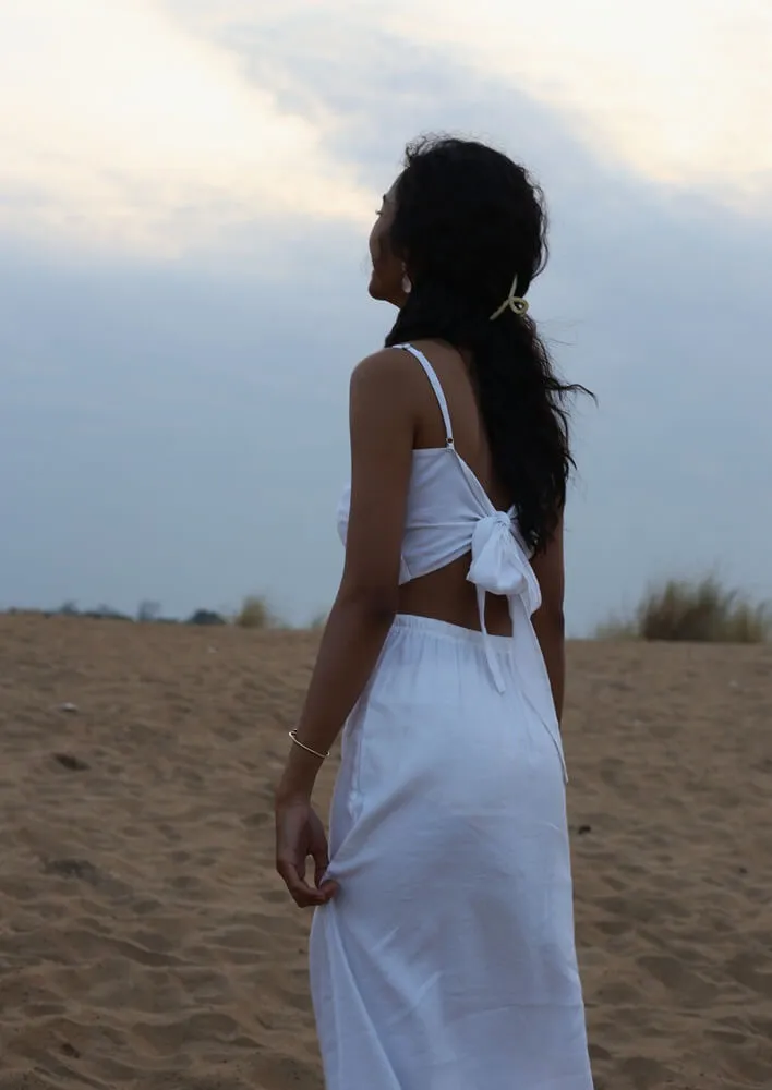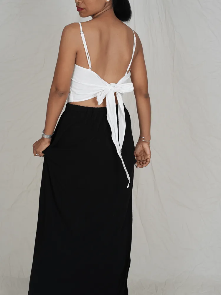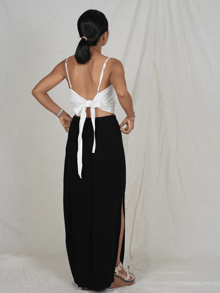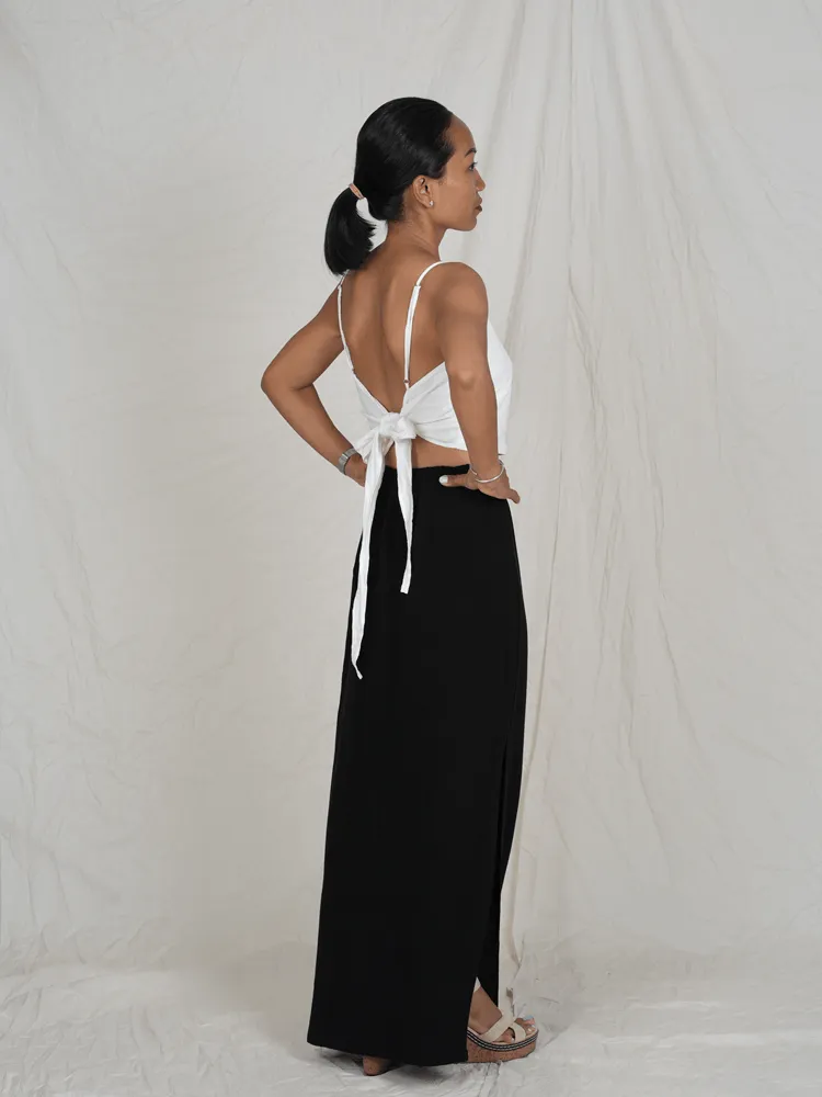 Simple neckline linen crop with adjustable straps and a bowtie back.