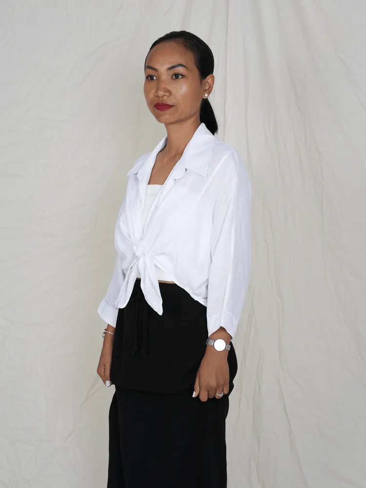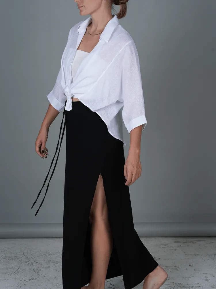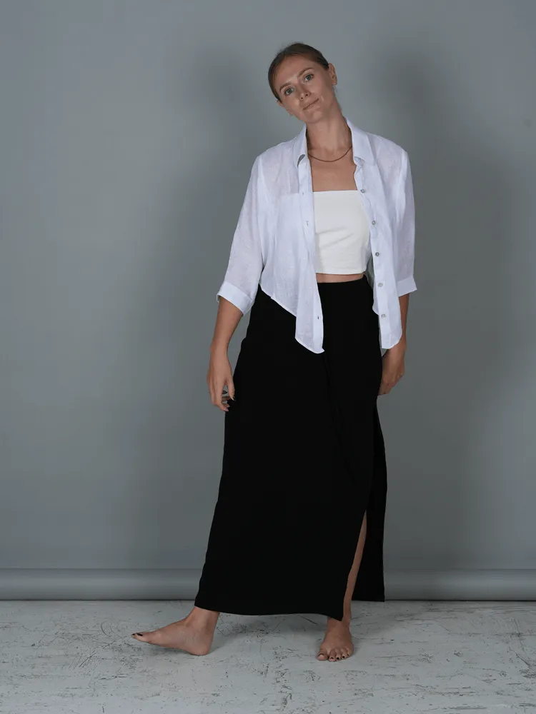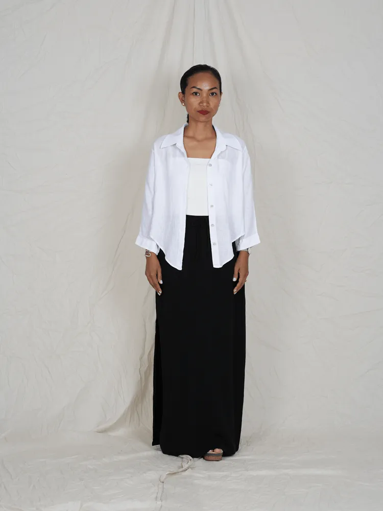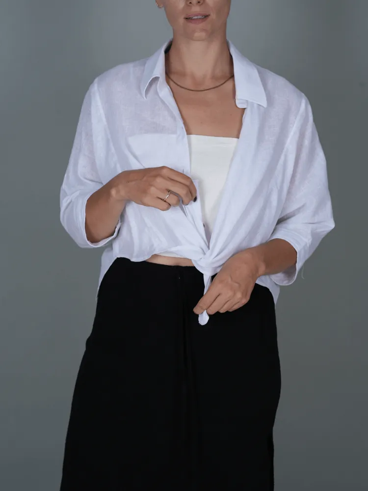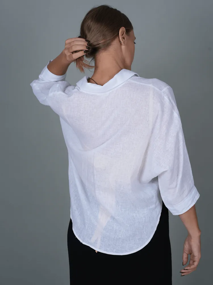 Relaxed-fit linen shirt with shell buttons and wide bat-wing sleeves cut to a 3/4 length.