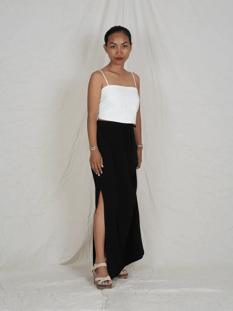 Straight-cut maxi skirt with elastic waist, drawstring, and side slit